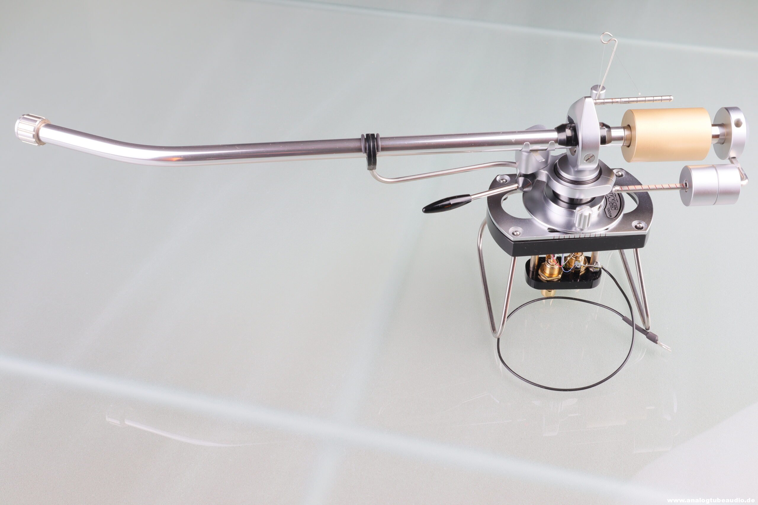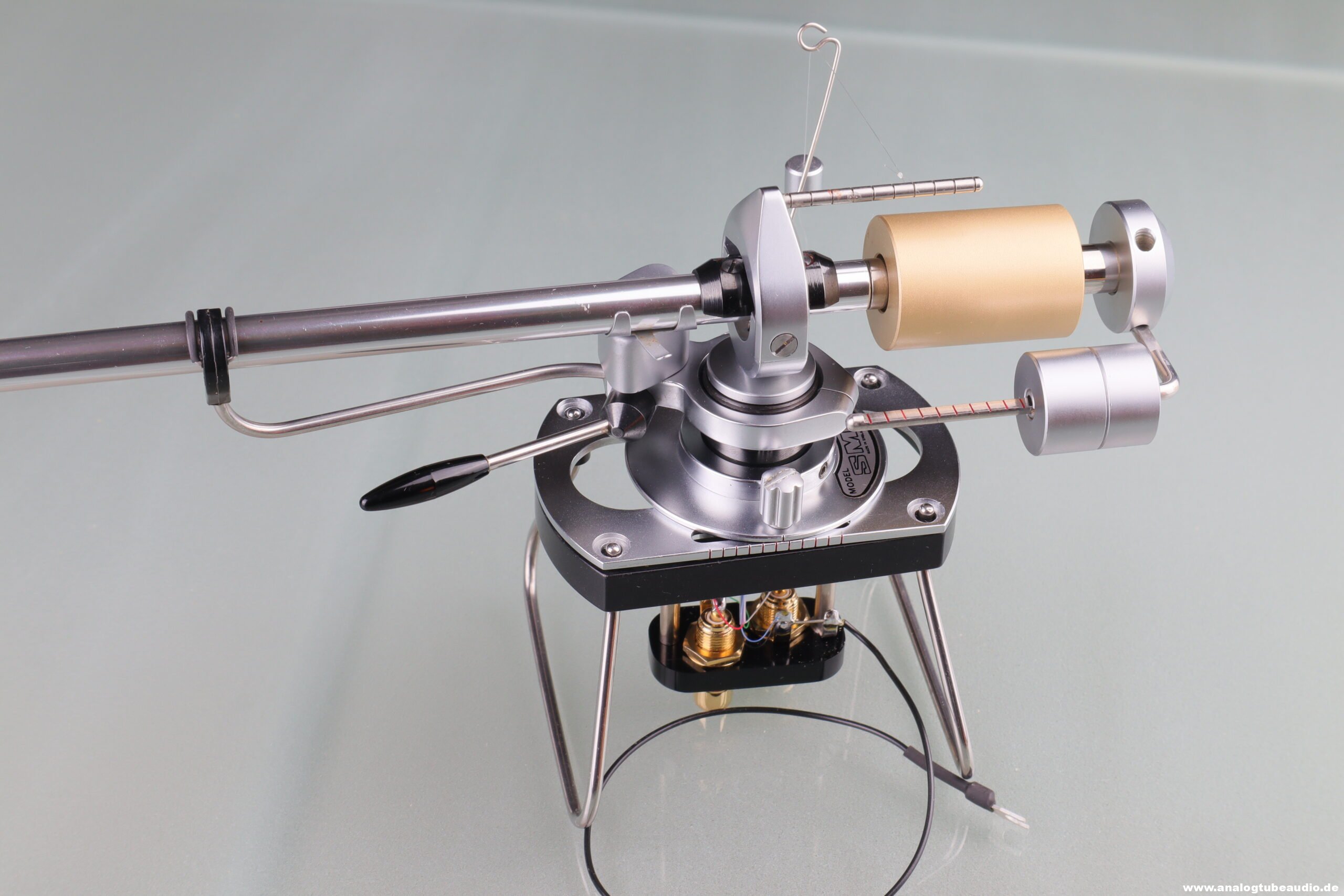 The original counterweight was destroyed by a earlier owner, so I copy the SPU-Counterweight in original dimensions. The old 4-pin connector is exchanged to a RCA Conversion Kit for a high quality connection the phono stage. The attached short ground cable is the connect the chassis of the Thorens TD124, there is no extra ground cable needed.
